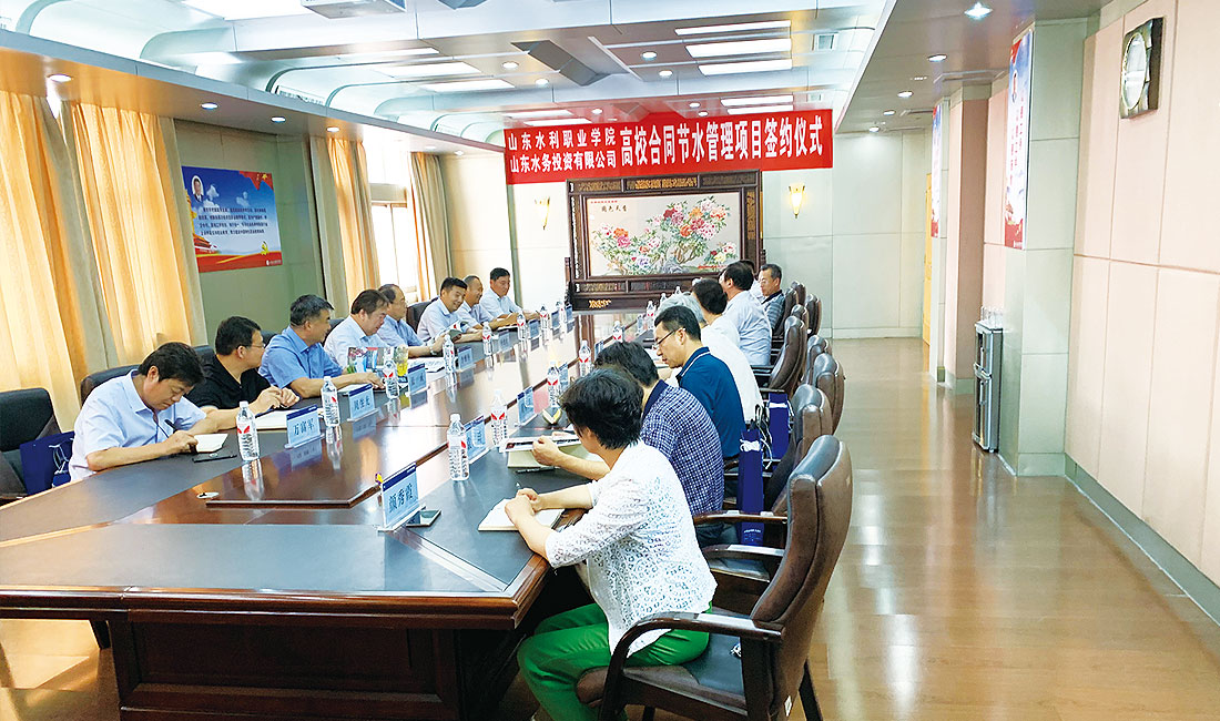山东水利职业学院成立于 1958 年,为全国优质水利高等职业院校、全国首批水利高等职业教育示范院校。学院教学区和办公区 2018 年总用水量为 13.71 万 m 3 ,水费为 43.32 万元。公司前期通过对学院用水现状、供用水设施等进行实地调研,编制了《山东水利职业学院合同节水管理示范项目实施方案》,方案主要通过对学校供水管网维修、雨水综合利用、室内洁具改造及用水计量设施安装等施工改造;实施水平衡测试,建立节水智能监控信息平台;配合学山东水利职业学院合同节水管理项目校制定节水管理制度,完善学校的用水、节水管理;校园节水宣传教育及节水示范基地建设等措施用来推进学院节水型高校的建设。经校党委会研究和专家论证通过该实施方案,并于 2019 年 7 月 12 日签订合作协议。