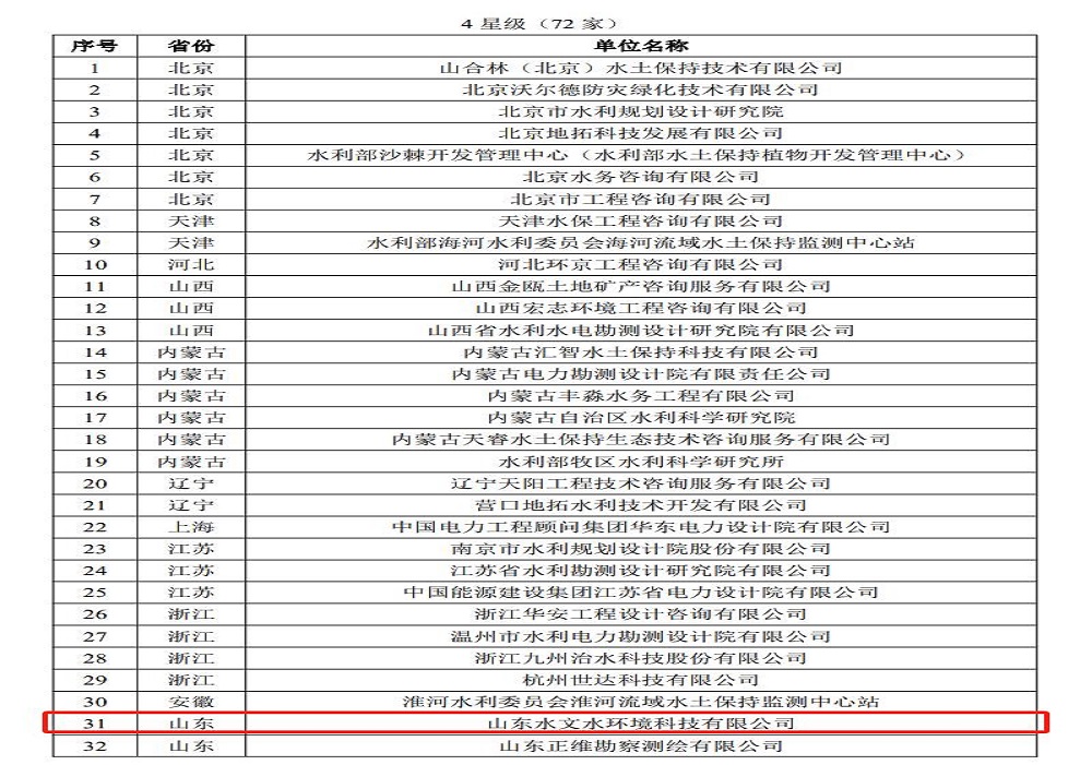 生产建设项目水土保持监测单位水平评价4星证书的成功取得,实现了公司“水土保持方案编制”“水土保持监测”步入双4星行列,意味着公司在水土保持方案编制、水土保持监测进入行业全国领先水平,此星级评价已充分满足市场招投标对水保单位的要求,水文科技公司承揽水保业务范围将更加宽广,市场竞争将更具实力。